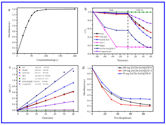 Photocatalysis is one of the environmentally friendly and sustainable strategies to eliminate the TC pollution [44]. Here, ZnCDs/ZnO@ZIF-8 was evaluated for the photocatalytic degradation of TC under visible-light illumination (λ > 420 nm). Figure 8a is the linear relationship between the concentration and Uv-vis adsorbance of TC. Before the photocatalysis experiments, the suspension was magnetically stirred in the dark for 60 min to make sure an adsorption-desorption equilibrium containing the catalyst powders and TC aqueous without illumination. As shown in Figure 8b, the photolysis of TC in the absence of photocatalysts can be neglected, which demonstrates that TC is very stable and hardly decomposed. Apparently, there was little adsorption phenomenon in ZnO, ZnCDs/ZnO, and CDs/ZnO, while the samples decorated with ZIF-8 showed a discernible adsorption. This phenomenon could be ascribed to the strong adsorption capacity of the wide nanopores interconnected through 0.34 nm windows assembled as an analogue zeolite sodalite structure of ZIF-8 [45,46]. Significant degradation of TC occurs when ZnCDs/ZnO hybridized with ZIF-8 (Figure 8c). Furthermore, the degradation rate was effect by the quantity of ZnCDs/ZnO@ZIF-8, as depicted in Figure 8d, the optimum dosage is 100 mg.