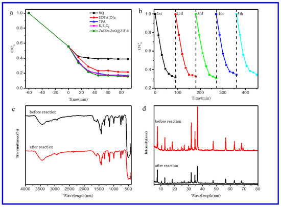 (a) Time-dependent photodegradation of TC over Zn-CDs/ZnO@ZIF-8 in the presence of different scavengers. (b) Cycling runs of Zn-CDs/ZnO@ZIF-8 (c) IR of Zn-CDs/ZnO@ZIF-8. (d) XRD of Zn-CDs/ZnO@ZIF-8 before and after reaction.