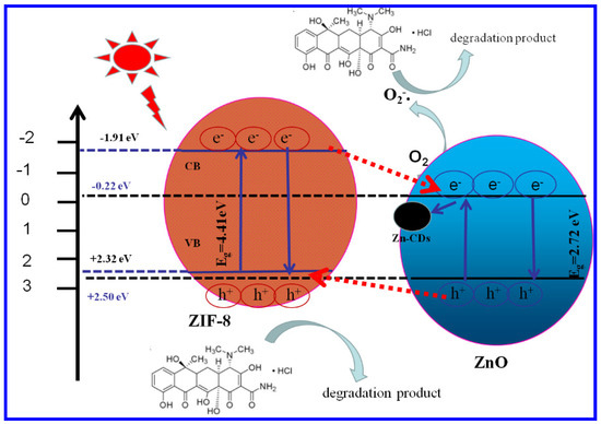 On the basis of the above experimental results over ZnCDs/ZnO@ZIF-8, photocatalytic mechanism is proposed and illustrated in Figure 10. The photocatalytic activity of ZnCDs/ZnO@ZIF-8 can be attributed to the ZnCDs/ZnO heterojunction and ZIF-8, which effectively facilitates the electron transfer and the separation of electron-hole pairs. During UV irradiation, electrons and holes are excited at the conduction band (CB) and the valence band (VB) on the composites, respectively. After that, electrons transfer from the excited state to the ZnCDs/ZnO and transform from O2 to ⋅O2−. ⋅O2− and holes at VB finally contribute to the degradation of tetracycline in the solution.