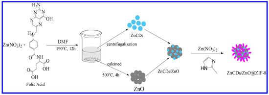 The synthesis procedure of ZnCDs/ZnO@ZIF-8 composites is shown in Scheme 1. The mixture of zinc nitrate hexahydrate, folic acid, and DMF was heated at 190 °C, and then cooled down. The product was separated into two parts: the solution was dialyzed and dried to obtain ZnCDs; the residual precipitate was calcined to form ZnO nanosphere, which was used as template for the preparation of ZnCDs/ZnO heterostructures. Finally, 2-methylimidazole was coordinated with zinc ions in the suspension of ZnCDs/ZnO to form the ZIF-8 crystal, which wrapped around ZnCDs/ZnO heterojunction nanosphere.