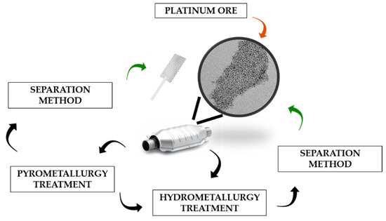 - Kizilaslan, E.; Aktaş, S.; Şeşen, M.K. Towards Environmentally Safe Recovery of Platinum from Scrap Automotive Catalytic Converters. Turk. J. Eng. Environ. Sci. 2009, 33, 83–90. [Google Scholar]