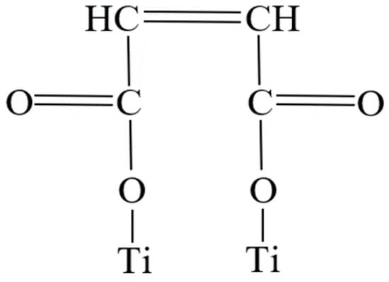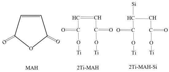 Figure 5 shows that the =C-H stretch in Ti-MAH is present. This peak is no longer present in the Ti-MAH-Si spectra seen in Figure 5, which verifies that the double bond breaks to bond silicon to Ti-MAH. The theorized structures of MAH, 2Ti-MAH, and 2Ti-MAH-Si are presented in Figure 6. (See the Supplementary Materials).