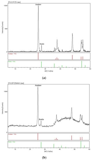 (a) XRD diffractogram of P25 titanium dioxide. (b) XRD diffractogram of functionalized Ti-MAH powder.