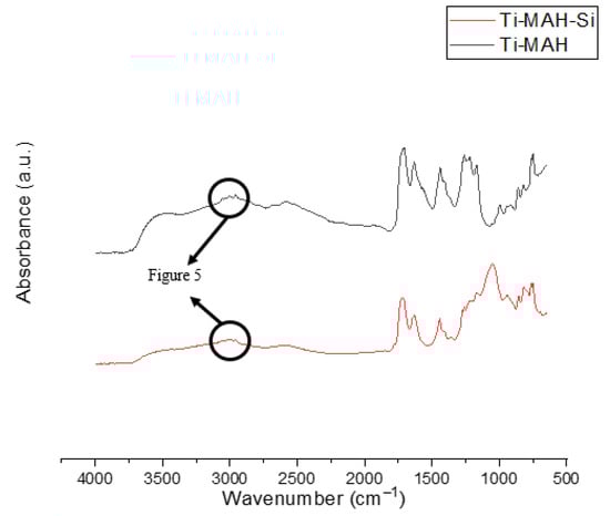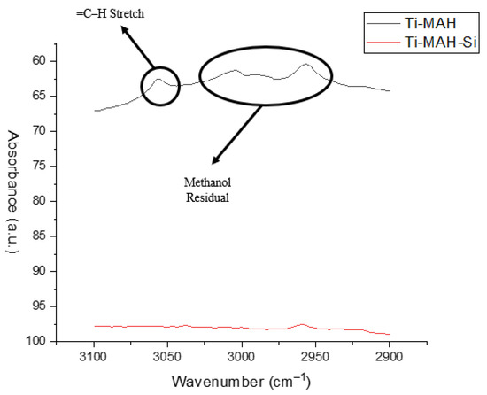 FTIR was performed on Ti-MAH and Ti-MAH-Si to determine bonding points to MAH (Figure 4). The two spectra demonstrate the vibration changes with the silica addition. The shift in and broadening of the MAH carboxylate peaks are still present, while some additional peaks are shown below 1500 cm−1. These vibration changes correlate with the silica spectra and are justified considering the silica addition. The primary peak of interest, which validates the MAH-Si bond, is the C-H stretch peak. The C-H stretch indicates whether a single bond, double bond, or triple bond is present in the structure. Vibrational peaks of the =C-H stretch in MAH are 3124 cm−1 [53].