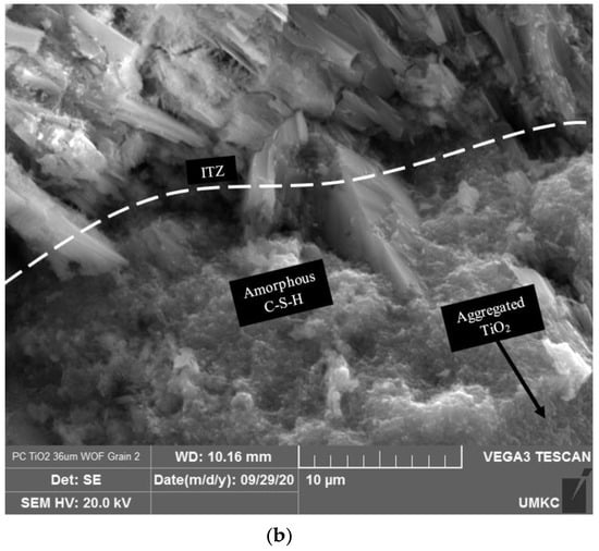 The heterogenous consistency is theorized to be from Ti-MAH bonding to C-S-H. Further analysis along the boundary of the aggregated TiO2 and the main cement paste composite verified the immobilization of the particles due to bonding within C-S-H (Figure 10b). Herein, amorphous C-S-H is interlocked with the aggregated TiO2 with crystal phases growing into C-S-H, substantiating complete immobilization. An interfacial transition zone (ITZ) is found surrounding the boundary of the aggregate TiO2 clumps, verifying that it acts as an aggregated particle [56].