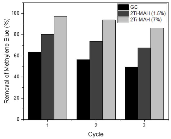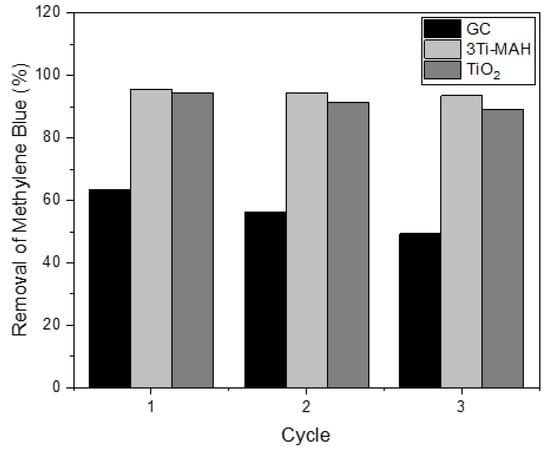 Photocatalytic reactivity testing was first performed on the mixes from Table 1 utilizing 3Ti-MAH and the ISO standard concentration of 10 mg/L methylene blue. Three repeated cycles of reactivity testing were performed on each batch, in order to compare the photocatalytic reactivity of the cement over time and across photocatalysts. Considering the kinetics of dye degradation, specifically methylene blue, have been previously studied [57,58], only cyclic testing was performed for this study. Figure 12 presents the results of the photocatalytic capacities over cycles. The OPC utilized was a gray cement and therefore is denoted as the gray control (GC), while the TiO2 and 3Ti-MAH mixtures are denoted as such. Each cycle of testing was performed over 45 min. The 3Ti-MAH mixture consistently tested more reactive than the gray control and TiO2 mixture and maintained that reactivity over time, which verifies that immobilization of the photocatalyst using Ti-MAH improves reactivity.