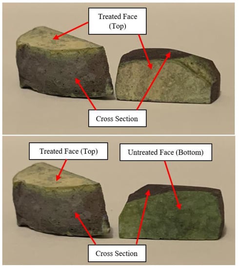 In an effort to further validate that functionalization is the primary reason for the improved reactivity of the Ti-MAH samples, Hydrion One Drop 1.0–11.0 indicator solution was applied to the top face, bottom face, and a broken cross-section of a 2Ti-MAH sample (Figure 14). Surface dying with phenolphthalein is commonly performed to assess the rate and/or point at which carbonation of the cement occurs [61]. However, phenolphthalein would not show the range of the pH of a cement sample with the distance from an exposed surface and requires an uncarbonated control sample. The indicator dye verified that the pH within the cement sample increased with the distance from the surface exposed to MB+ solutions during treatment. Surfaces directly exposed to the MB+ solution during cycles are dyed yellowish orange, indicating a pH of approximately 6 S/U. As the distances increase from the treatment surface, the dye coloration exhibits a color ramp or gradient from light grayish blue to intense purple, representing a rise in pH above 11 S/U. The cross-section further validates that the pH was reduced to below 8.0 pH in Ti-MAH and that the difference in performance is from the enhanced reactivity due to functionalization.