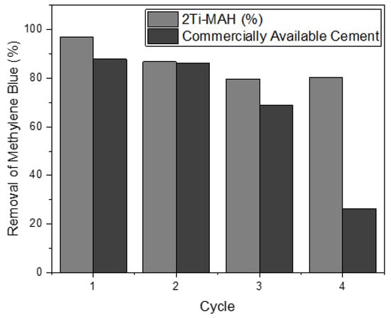 While the increased reactivity of 2Ti-MAH compared to TiO2 was demonstrated in trials utilizing gray cement, additional testing was performed using white cement to compare against a commercially available photocatalytic cement. The exact percent of TiO2 in the commercially available cement is unknown; however, it is estimated to be approximately 5–8%. Therefore, 2Ti-MAH was inter-ground with a white cement base from the same source as the commercially photocatalytic available cement. Four 30 min cycles were performed, as shown in Figure 15. Similar removal rates are seen in cycles 1–3, with 2Ti-MAH being more reactive and retaining a greater degradation percent. Between cycles 3 and 4, the commercially available photocatalytic cement decreases in efficiency by more than two times that of 2Ti-MAH. 2Ti-MAH remains equally as reactive as the cycle before. The rapid decrease in the removal capacity of the commercially available cement signifies fouling on the surface; therefore, further cycles were not tested. Additional experimentation and cycling of 2Ti-MAH against other organic contaminants are needed to understand how it will compare fully to current photocatalytic cements. However, the results validate that using 2Ti-MAH is a superior process for the development of photocatalytic cement.