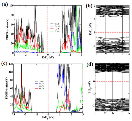 PDOS and band structure of (Zn, Zr)-codoped {0001} α-Fe2O3 surface (a,b) and (Zn, 2Zr)-codoped {0001} α-Fe2O3 surface (c,d). The Fermi level is set to zero.