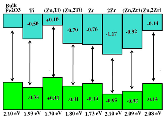 Moreover, Zhu et al. [5] argue that among the dopants that have been incorporated in hematite, Ti stands out because of its ability to increase the photocurrent significantly through enhanced conductivity and carrier density. However, Ti’s capability to resolve the challenge of recombination of electron–hole pairs is comparatively limited. The solution to this challenge lies in codoping Ti with a p-type element such as Zn [4,5,30]. Many studies have shown that Zn is a p-type dopant for α-Fe2O3, while Ti is an n-type element [5,19,28,36,48,49]. Therefore, the combination of (Zn, Ti) forms an acceptor–donor pair. Codoping both n-type and p-type elements is expected to offset the negative effects aroused by each element while at the same time enhancing their positive effects. Additionally, Zn is capable of promoting faster charge transfer at the surface, resulting in reduced recombination of the electron–hole pairs [4,5]. Therefore, the combination of Zn with Ti or Zr is expected to improve the PEC performance of hematite due to increased conductivity and improved surface reaction kinetics. As stated earlier, Figure 3e,f presents PDOS and band structure of (Zn, Ti) codoped {0001} hematite surface. It is inferred from Figure 3e,f that although the codoping localised acceptor states consisting of Zn 3d orbitals and O 2p orbitals appear above the VBM of the surface, the Fermi level embeds in the VBM due to the upshift in the valence band edge, and the bandgap narrows down to 1.70 eV. We observe that although there is an appreciable decrease in the bandgap and an upshift in the CBM, compared to mono-doped Ti which effectively suggests increased photocatalytic efficiency of the {0001} hematite surface, the PEC activity is not likely to increase much due to localised acceptor states.