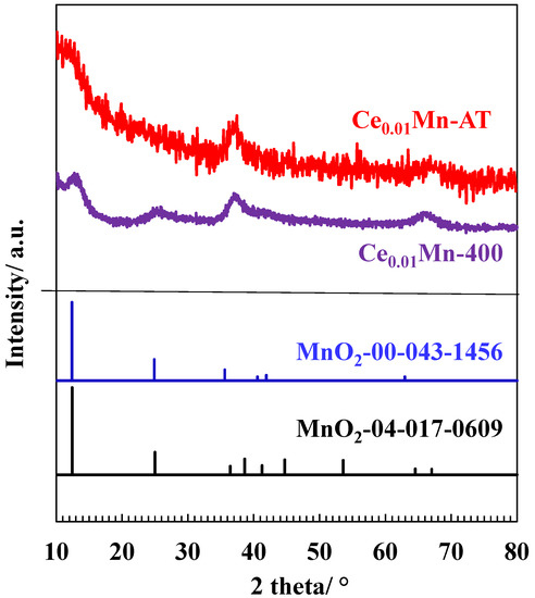 The powder XRD patterns of the samples are shown in Figure 1. The Ce0.01Mn-400 sample was poorly crystallized and exhibited four broad peaks centered at 12.2° (001), 24.5° (002), 37.0° (110) and 66.2° (110), which are characteristics of a turbostratic birnessite structure [26]. The XRD pattern of the Ce0.01Mn-AT sample was ill-defined and presented diffraction peaks centered at 37.0° and 66.2°. However, the two diffraction peaks (001) and (002) were no more visible in the powder XRD pattern of the Ce0.01Mn-AT sample. This could have been related to the diminution of the number of layers stacked in the crystal after the acidic treatment. Indeed, when the coherent scattering domain size decreases, the intensity of the peaks decreases and their full width at half the maximum increases [27,28].