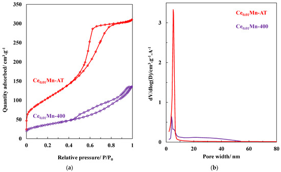 (a) N2 adsorption and desorption and (b) pore size distribution of Ce0.01Mn-400 and Ce0.01Mn-AT samples.