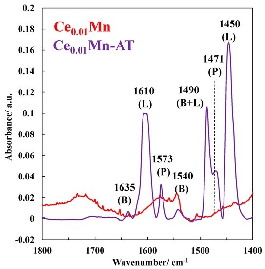 The change in surface acidity was evaluated using pyridine as an infrared probe molecule for the dried Ce0.01Mn-and Ce0.01Mn-AT samples. FTIR spectra of the pyridine region obtained after pyridine adsorption at 150 °C for the dried Ce0.01Mn and Ce0.01Mn-AT samples are shown in Figure 3. The interaction of pyridine with dried Ce0.01Mn led to a spectrum with large bands. A narrower band can be observed at 1540 cm−1, which can be assigned to the formation of pyridinium ions resulting from pyridine protonation on Brønsted acid sites. The interaction of pyridine with Ce0.01Mn-AT gave rise to a set of several bands: (i) two bands at 1540 and 1635 cm−1, associated with pyridinium ions resulting from pyridine protonation on Brønsted acid sites; (ii) two bands at 1450 and 1610 cm−1, attributed to pyridine coordinated with Lewis acid sites; and (iii) overlapping bands of pyridine on Lewis and Brønsted acid sites at 1487 cm−1 [22,30,31,32,33]. Moreover, the band at 1573 cm−1 can be attributed to the pyridine physisorption (P) [20], while the band at 1471 cm−1 could have resulted from the interaction between the adsorbed pyridine and manganese oxides [34]. Mn3+ and Mn4+ species, as coordinatively unsaturated metal atoms which can accept an electron pair, can be considered as Lewis acid sites, while the hydroxyl groups attached to the metal oxides (Mn-OH) can be identified as Brønsted acid sites [35].