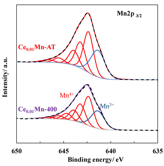 The surface speciation of manganese species in both samples was assessed by analyzing the 2p photopeak of Mn. The Mn 2p3/2 signal was decomposed by considering a mixture of Mn (III) and Mn (IV), as shown in Figure 4 [36]. The obtained Mn3+/Mn4+ ratio was higher for the acid-treated sample (0.38) compared to the calcined one (0.34). In addition to curve-fitting of the Mn 2p3/2 signal, the Mn 3s photopeak can also provide useful insight into the Mn average oxidation state (Mn AOS) [37,38]. Indeed, the Mn 3s photopeak is split into two signals and the value of the splitting is an indication of the average oxidation state of Mn. The Mn AOS values calculated from the Mn 3s splitting were 3.32 and 3.44 for the Ce0.01Mn-400 and Ce0.01Mn-AT samples, respectively. These results agree with the aforementioned Mn3+/Mn4+ ratio. As expected, the acid treatment generated additional oxygen vacancies to maintain electronic balance, and more Mn3+ species were present at the surface of the Ce0.01Mn-AT sample [23,39].