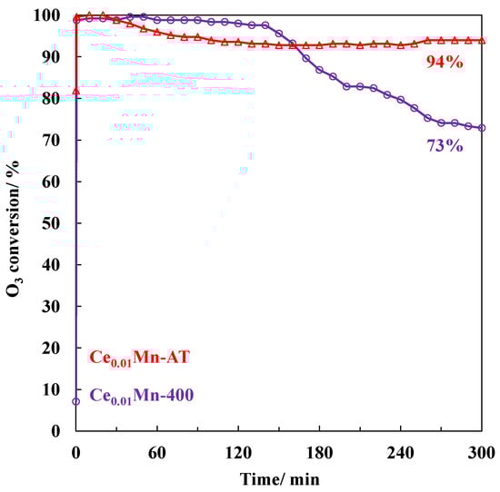 Figure 5 presents the ozone decomposition at room temperature as a function of time with Ce0.01Mn-400 and Ce0.01Mn-AT catalysts. Ce0.01Mn-400 maintained high ozone conversion (>97%) for 140 min but then showed a gradual decrease in ozone conversion to 73% after 5 h. Ce0.01Mn-AT exhibited different behavior, with a low decrease in ozone conversion after 30 min of testing from 100% to 94% after 120 min. Thereafter, Ce0.01Mn-AT was able to maintain this high conversion over time. It has been reported previously that oxygen vacancies play a key role in ozone decomposition in manganese oxides. Therefore, the better catalytic performance of Ce0.01Mn-AT compared to that of Ce0.01Mn-400 was consistent with its more abundant oxygen vacancies, which were in accordance with the larger amount of surface Mn3+ species (XPS). This result confirms the important role of oxygen vacancies in catalytic ozone decomposition, as reported in the literature [40,41,42,43]. In addition, the larger specific surface area of Ce0.01Mn-AT may contribute to a wider surface exposure of oxygen vacancies. This could explain the high ozone conversion maintained in the presence of Ce0.01Mn-AT alongside the avoidance of the saturation of the oxygen vacancies sites, which was probably at the origin of the deactivation observed in the presence of Ce0.01Mn-400 [44,45].