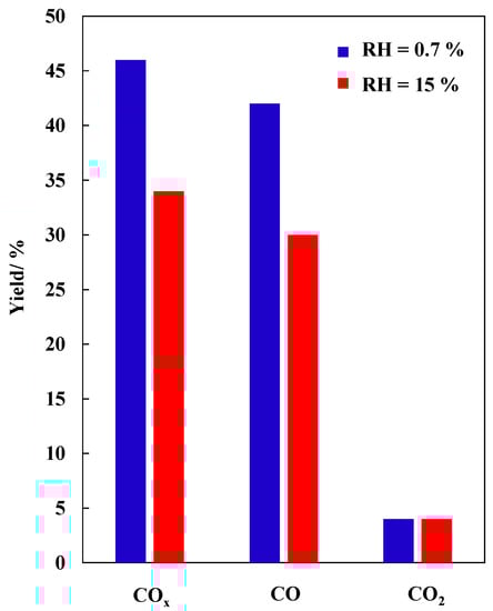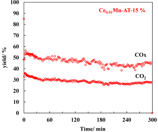 The effect of relative humidity on the PPC process for TCE decomposition was studied in the presence of Ce0.01Mn-AT as the best catalyst. Figure 11 shows the COx and CO2 yields obtained as a function of time in humid air (RH = 15%). In comparison with the RH = 0.7% condition, the yields were lower but rather stable during the 5 h of the experiment.