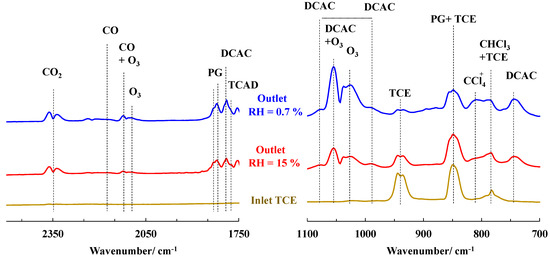The FTIR spectra of the inlet TCE and outlet stream after NTP TCE abatement, with 0.7% and 15% as the relative humidity, are presented in Figure 7. The FTIR spectra for the inlet TCE showed the characteristic bands of TCE. The characteristics bands for TCE at 945 and 865 cm−1 were still present but their relative intensities were higher in humid air, in accordance with the lowest TCE conversion discussed above. Furthermore, (oxi-)chlorinated by-products, such as dichloroacetchloride (DCAC; IR bands at 740, 989, 1076, 1055 (overlap with O3) and 1773 cm−1), phosgene (PG; IR bands at 852 (overlap with TCE) and 1827 cm−1) and trichloroacetaldehyde (TCAD; IR band at 1760 cm−1), were also detected in line with the incomplete gaseous oxidation of TCE. The detection and possible reaction schemes of formation of such (oxi-)chlorinated oxidation by-products have already been discussed elsewhere [46,47,48]. With almost no water in the feed (RH = 0.7%), TCE molecules react with ClO radicals to produce DCAC, then DCAC molecules further decompose from the attack of Cl radicals to produce CCl4, CHCl3 and COCl2 molecules [46,53]. However, with RH of 15%, ClO radicals will certainly be quenched by OH radicals (coming from H2O), leading to a lower amount of DCAC (Figure 7).