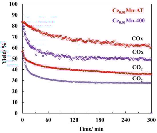 In the PPC configuration with RH = 0.7%, TCE was fully converted regardless of the catalysts (Ce0.01Mn-AT and Ce0.01Mn-400) used. Figure 8 shows the COx and CO2 yields with the two catalysts as a function of time. Compared with NTP, the COx yield increased and the CO2 yield especially significantly improved from 4 to 58% at t = 0. Of the two PPC configurations, the one with Ce0.01Mn-AT downstream of the NTP outperformed the one with Ce0.01Mn-400 for the 5 h test. For both configurations, COx and CO2 yields decreased over the time of the reaction. However, for Ce0.01Mn-400 the decay was more pronounced during the first 30 min. After 120 min the catalysts seemed to reach a steady state, as the COx and CO2 yield values were rather constant (Figure 8).