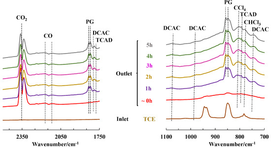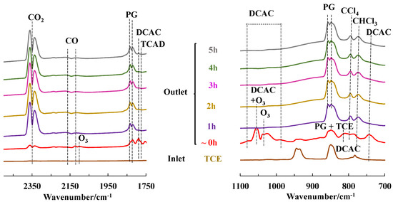 FT-IR spectra of the inlet TCE and outlet gaseous stream after the PPC process (RH = 15%) with Ce0.01Mn-AT as the catalyst as a function of time. PG: phosgene; DCAC: dichloroacetylchloride; TCAD: trichloroacetaldehyde.