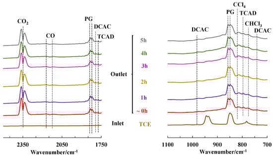 FT-IR spectra of the inlet TCE and outlet gaseous stream after the PPC process (RH = 0.7%) as a function of time with Ce0.01Mn-AT as the catalyst. PG: phosgene; DCAC: dichloroacetylchloride; TCAD: trichloroacetaldehyde.