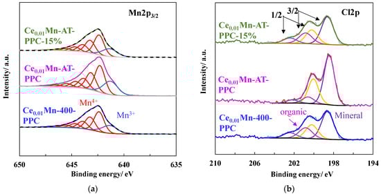 After the PPC process, a slight oxidation of manganese species was observed at the surface in both catalysts. Indeed, the Mn3+/Mn4+ decreased (Figure 13a), which was in agreement with the increase of Mn AOS calculated from Mn 3s splitting (Table 3). All catalysts also presented a surface Ce enrichment in Mn after the PPC process. After the reaction, the chlorine element was detected on the surfaces of both catalysts (Table 3). This can be explained by the incomplete degradation of TCE during the PPC process. The Cl 2p core level envelope can be simulated by considering two types of chlorine (Figure 13b). The Cl 2p3/2 photopeak at 198.5 ± 0.2 eV can be attributed to metal (M) chloride, with M = Ce and/or Mn [49,52], while the Cl 2p3/2 photopeak at 200.6 ± 0.2 eV can be ascribed to (oxi-)chlorinated organic species such as CHxCly(Oz) [49,52]. The organic chlorine to mineral chlorine ratio (Clorg/Clmin) was calculated for the tested catalysts. The best catalyst for TCE degradation (Ce0.01Mn-AT) presented a lower Clorg/Clmin ratio (0.14) in comparison with the ratio obtained for Ce0.01Mn-400 (0.42), suggesting that the formation of (oxi-)chlorinated organic species at the surface is detrimental to the catalytic performance. This assumption is reinforced by comparing the ratios obtained for the catalysts tested in different RH conditions. Indeed, with RH = 15%, the activity of Ce0.01Mn-AT was lower and the Clorg/Clmin ratio was higher (0.35).