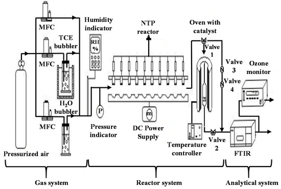 Figure 14 presents the schematic diagram of the experimental setup, which consisted of three main parts: the gas analysis system, the reactor system (NTP reactor and catalyst reactor) and the gas analysis system. A total of 300 ppm of ozone was generated by flowing 1L/min of dry air (RH = 0.7%) through the NTP reactor. Ozone concentration was obtained via linear regression applied to the integration area (obtained by FTIR in the range of 1050 to 1000 cm−1) as a function of the ozone concentration obtained with an ozone monitor (Teledyne API’s model 465M). Ozone decomposition tests were carried out for 5 h at atmospheric pressure and room temperature (20 °C) over 0.05 g of catalyst mixed with 1 g of SiC (EMB 45053 Prolabo, 0.150 mm). The ozone conversion efficiency was calculated using the following equation: