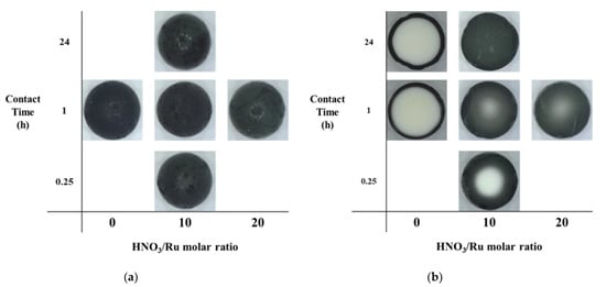 In addition, the Ru distribution in the pellet interior was different, depending on the HNO3/Ru molar ratio and the contact time. Ru penetrated the pellets better as the HNO3/Ru molar ratio increased. The difference in contact time exhibited a notable difference inside the pellet when the HNO3/Ru molar ratio was fixed at 10. The RA (10, 0.25 h) showed the eggshell profile, indicating that the concentration of Ru was low in the center of the pellet. When the contact time reached 1 h, i.e., (RA (10, 1 h)), the boundary became more blurred. RA (10, 24 h) with sufficient contact time showed a uniform color distribution (homogeneous type). The shell thickness of the eggshell layer could be effectively adjusted by controlling the HNO3/Ru molar ratio and contact time until a homogeneously impregnated pellet was obtained.