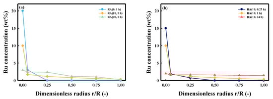To investigate the distribution of the pellets inside the Ru, the concentration of Ru was measured using SEM-EDS in the cross-section of the catalysts from the edge to the center (Figure 2). Figure 2a shows the difference in Ru distribution based on the HNO3/Ru molar ratio. For the RA (0, 1 h) catalyst, a high concentration of Ru was detected only on the external surface of the catalyst (r/R of ~0.05). This is because the strong metal precursor–support interaction prevented the Ru precursor from penetrating the pellet. However, Ru was found inside the pellet when HNO3 was added. The concentration of the Ru inside the pellet gradually increased as the amount of the HNO3 added in the impregnation solution increased, whereas the concentration of Ru on the external surface of the pellet decreased. In addition, we confirmed the relationship between the distribution of Ru and contact time in Figure 2b. The total Ru concentration of RA (10, 0.25 h) inside a pellet was less than those of the others. For the homogeneous catalyst (RA (10, 24 h)), the concentration of Ru was similar (~2 wt%) in all regions, including the external surface of the pellet. The change in Ru concentration, on the external surface, decreased with the contact time.
