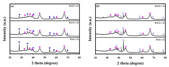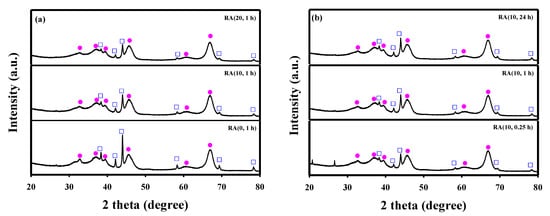 XRD patterns of the Ru/Al2O3 catalysts after long-term stability tests: (a) different HNO3/Ru molar ratios and contact time fixed at 1 h; (b) HNO3/Ru ratio fixed at 10 and different contact times.