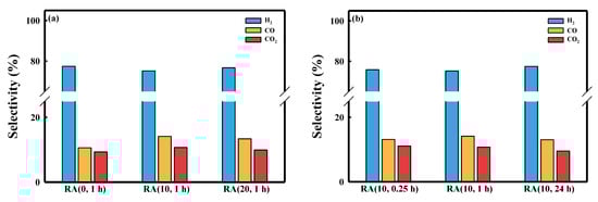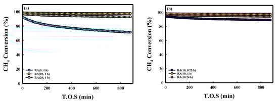 Figure 4 shows the CH4 conversion as a function of time on stream (T.O.S) for five kinds of Ru/Al2O3 catalysts. Figure 4a shows that RA (0, 1 h) exhibited the lowest initial XCH4 (~91%). On the other hand, RA (10, 1 h) and RA (20, 1 h) showed higher catalytic activities than RA (0, 1 h) did. The RA (10, 1 h) catalyst showed the highest XCH4 (98%), close to the equilibrium conversion (98%). The RA (20, 1 h) catalyst showed slightly lower XCH4 because RA (10, 1 h) showed a higher Ru concentration on the external surface of pellets. In the absence of HNO3, the catalyst (RA (0, 1 h)) was deactivated (from 91% to 72%) due to the poisoning of NH3 by the byproduct of the reaction (N2 + 3H2 = 2NH3) [20]. The RA (0, 1 h) catalyst did not show deactivation when nitrogen was replaced with argon (Figure S2). Deactivation was not observed with RA (10, 1 h), even in a nitrogen atmosphere, and this difference seemed to be due to the smaller Ru crystallite size. From these results, we confirmed that the addition of HNO3 increased the Ru dispersion, but not the methane conversion [21]. The CO selectivity of RA (0, 1 h) was lower than those of other catalysts, attributed to the water–gas shift reaction (WGS, CO + H2O = CO2 + H2) (Figure 5a) [22]. During the SMR reaction using the RA (0, 1 h) catalyst, more water was available because of the lower CH4 conversion, thus increasing the H2O/CO ratio, favoring WGS equilibrium. In the case of RA (10, 1 h), the CO, CO2 carbon-based selectivity did not change over time; however, the CO selectivity of RA (0, 1 h) decreased because the methane conversion rate decreased with T.O.S. (Figure S3). For this reason, the H2/CO ratio of the RA (0, 1 h) catalyst was higher than those of other catalysts (Table S2). When the HNO3/Ru molar ratio was 10, the activity of the SMR reaction was similar for all catalysts because of the similar Ru crystallite size (Figure 4b). In addition, Figure 5b shows that the selectivity of catalysts with a fixed HNO3/Ru molar ratio at 10 was not significantly different.