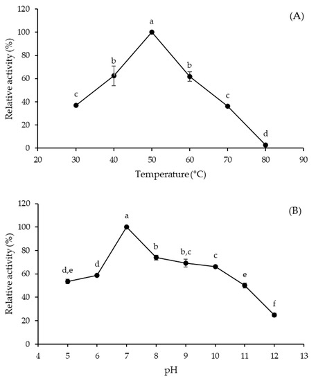 Effects of temperature (A) and pH (B) on the activity of Aspergillus tamarii URM4634 protease produced by sequential fermentation using wheat bran as a substrate. Different letters (a–f) indicate statistically significant differences (p < 0.05).