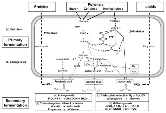 The biological process is initiated by (a) hydrolysis of polymers to monomers and oligomers; (b) these monomers are then converted by mixed cultures via acidogenesis to pyruvate that leads to the production of intermediate carboxylates, ethanol, lactate, hydrogen and carbon dioxide. (c) These products are converted by mixed cultures via various reactions, including autotrophic homoacetogenesis of carbon dioxide and hydrogen to more acetate; (d) reduction of the carboxylates with hydrogen or ethanol to produce various alcohols, e.g., propionate to propanol; (e) chain elongation of the VFA to medium-chain fatty acids by reverse-β-oxidation with ethanol or lactate to produce medium-chain fatty acids; and (f) methanogenesis with either (i) hydrogenotrophic methanogens that produce methane and water from carbon dioxide and hydrogen; or (ii) acetoclastic methanogenesis where acetate is converted to methane and carbon dioxide (adapted from Agler et al. [] and De Groof et al. []).