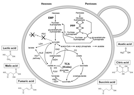 As intermediates of the tricarboxylic acid (TCA) cycle, organic acids play an important metabolic role in all living cells to produce reduced NADH and FADH2 as well as other cellular components. These organic acids have functional groups that render them potential building blocks for the commercial production of other high-value chemicals [], such as acetic, lactic, citric, fumaric, succinic and malic acid. Citric, fumaric, succinic and malic acid are (mitochondrial) TCA cycle intermediates, whereas lactic and acetic acids are usually produced in the cytosol from malic acid and pyruvic acid, respectively. A simplified representation of the TCA cycle (Figure 2) indicates the C6 and C5 inputs via the Embden–Meyerhof–Parnas (EMP) and pentose phosphate pathway (PPP), respectively, as well as other pathways related to organic acid intermediates of interest (highlighted in the text boxes). These pathways include malolactic fermentation, glyoxylic acid cycle (GAC), malate-pyruvate interconversion and oxaloacetate-pyruvate conversion.