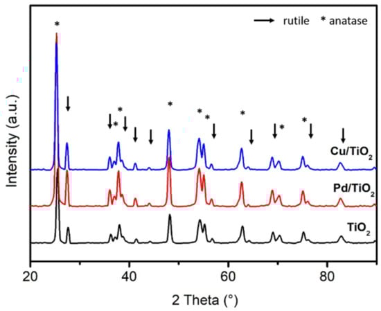The XRD patterns of the samples are shown in Figure 1. Only anatase and rutile phases were detected. The peak positions are the same among all samples, indicating that adding metals did not change the crystalline phases of TiO2. No XRD peaks for Pd and Cu were detected, indicating that Pd and Cu metal particles were very less than 4 nm.