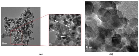 The morphologies, dispersive effect and particle sizes of the samples were determined by the TEM, JEOL, Tokyo, Japan, JEM-2000 FX II. HRTEM was operated on a JEOL JEM–2010 operated at 200 kV. A small amount of sample was put into a sample bottle filled with distilled water and agitated under an ultrasonic environment for 1 h. One drop of the dispersed slurry was dipped onto a carbon-coated nickel mesh (200 #; Ted Pella Inc., Altadena, CA, USA), and dried in the vacuum oven at 65°C overnight to remove the water entirely. The chemical composition of the samples and the interaction of the metals were determined by Energy-dispersive X-ray spectroscopy (EDS) attached on the HRTEM. The HRTEM (JEOL JEM-F200, Tokyo, Japan) images were recorded digitally by a Gatan slow-scan camera (GIF) (AMETEK, Berwyn, PA, USA).