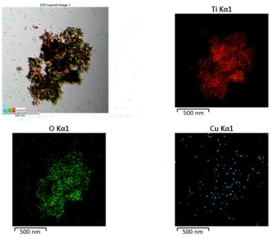 The EDS mapping of each element on Pd/TiO2 are shown in Figure 4. It clearly shows that Pd metal particles were homogeneously distributed on the surface of TiO2, in consistent with HR-TEM result. Figure 5 shows the EDS mapping of each element on Cu/TiO2. Cu metal particles were also homogeneously distributed on the surface of TiO2. The EDS results also show that the Pd and Cu metal loadings are 0.498 wt.% and 0.506 wt.%, respectively. The real metal loadings are the same as the nominal loadings within experimental error. Since the catalysts were prepared by incipient-wetness impregnation, it is very easy to have the same metal loading as that in the precursor.