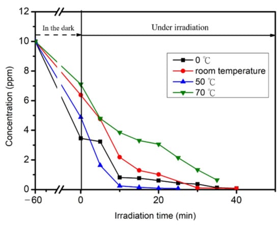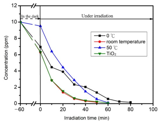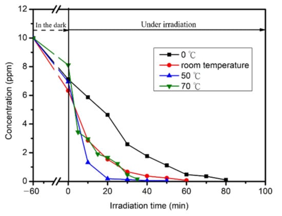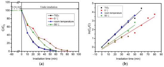 Figure 6 shows the concentration of methylene blue vs. time on TiO2 at various reaction temperatures. Some of methylene blue was adsorped on TiO2. Figure 7a shows the results of the C/C0 of bare TiO2 vs. reaction temperature, where C is the concentration of methylene blue and C0 is the initial concentration of methylene blue. It shows that the activity at 50 °C was higher than those at other temperature. It can be noted that when the reaction temperature was 0 °C, the reaction rate was very low. It has been known from the literature that when the temperature is lower, the solubility of methylene blue in the water is lower [42]. This may cause partial condensation of methylene blue in water.