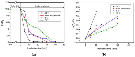 (a) Photodegradation of Cu/TiO2 at different reaction temperatures; (b) Photocatalytic activities of Cu/TiO2 at different reaction temperatures by plotting ln(C0/C) versus irradiation time (min).
