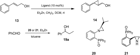 2.3. Asymmetric Simmons-Smith Cyclopropanation Promoted by Aziridine-Phosphines 1–8 and Imine-Phosphines 9–12