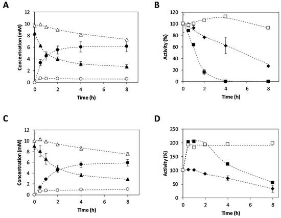 - Börner, T.; Rämisch, S.; Reddem, E.R.; Bartsch, S.; Vogel, A.; Thunnissen, A.-M.; Adlercreutz, P.; Grey, C. Explaining Operational Instability of Amine Transaminases: Substrate-Induced Inactivation Mechanism and Influence of Quaternary Structure on Enzyme–Cofactor Intermediate Stability. ACS Catal. 2017, 7, 1259–1269. [Google Scholar] [CrossRef]