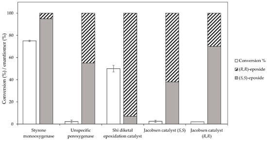 Several possibilities to perform asymmetric epoxidations exist with Sharpless and Katsuki being pioneers in this field []. However, the so-called Sharpless epoxidation is very specific for allylic alcohols, as the substrate’s hydroxyl group is used as a pivot point [,]. A few years later, Jacobsen and Katsuki reported asymmetric epoxidations using salen complexes surrounded by a chiral environment []. With the Jacobsen–Katsuki epoxidation, high selectivity can be achieved mostly towards cis-di-substituted olefins [], whereas selectivity towards trans-olefins was found to be low [,]. Dioxirane can perform epoxidations of olefines as well, and the enantioselectivity can be controlled by a chiral environment in the dioxirane’s surroundings. The most notable example is the Shi epoxidation [], which makes use of a carbohydrate-derived rigid scaffold to enhance enantioselectivity []. This fructose-derived ketone (Shi epoxidation diketal catalyst), when activated by an oxidative agent such as Oxone© or H2O2, shows optimal performance with unfunctionalised trans-olefins in contrast to the Jacobsen catalysts (i.e., (salen)manganese complexes) [,]. Compared to those chemical approaches, nature has evolved different oxidative enzymes to perform asymmetric epoxidations of olefins using molecular oxygen. The most popular ones are monooxygenases, oxidases, and peroxygenases [,,]. Among these, styrene monooxygenases have gained attention for their extremely high stereoselectivity in the epoxidation of C=C bonds. The substrate scope of these enzymes is generally limited to vinyl aromatic compounds with few exceptions [,]. However, a recently characterised styrene monooxygenase from Rhodococcus sp. ST-10, was found to convert also short-chain aliphatic alkenes with good performance []. Interestingly, most known enzymes preferentially produce (S)- or (S,S)-epoxide enantiomers [,,,], while (R)-selective styrene monooxygenases have only been reported very recently [,,].
