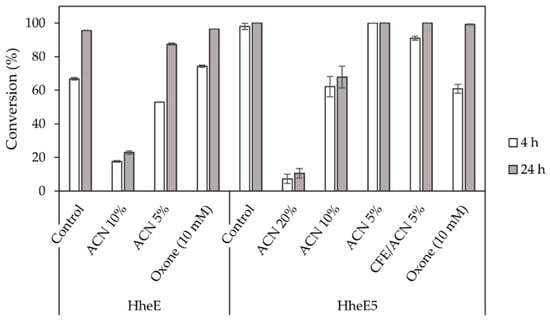 The influence of acetonitrile (5%, 10%, or 20% v/v) and Oxone© (10 mM) on the HHDHs was tested in 4 mL of 50 mM potassium phosphate buffer at pH 7.5. Then, 10 mM substrate (2 or 5 for HheE and HheE5, respectively) and 40 mM sodium azide (NaN3) were added and the solution was magnetically stirred at 25 °C and 600 rpm. After 4 h and 24 h of reaction, samples were taken for GC analysis.
