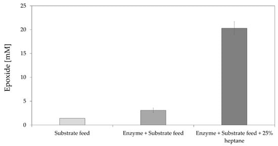 Finally, we tested the addition of a second organic phase, acting as substrate and product sink, to improve product formation further by alleviating also product inhibition [,]. Several organic solvents of different polarity were tested and, in general, solvents with logP > 4, such as cyclohexane, heptane, and isooctane, improved epoxide production (Supplementary Materials, Figure S6), whereas the use of more polar organic solvents, such as ethyl acetate, pentyl acetate, or hexyl acetate [], did not yield any epoxide (data not shown). Heptane was finally chosen as organic solvent for its lower boiling point compared to isooctane. Using heptane (25% v/v) as the second organic phase resulted in a four-fold increase in product concentration compared to the best StyAB-catalysed reaction without organic solvent (Figure 4). Overall, the use of an aqueous–organic two-phase system had the highest positive effect on product formation in the StyAB-catalysed epoxidation among all variables tested.