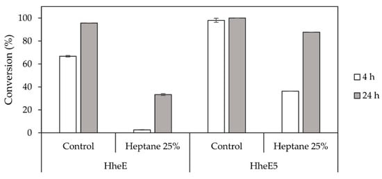 Since optimisation of the StyAB-catalysed epoxidation reaction highlighted the need for a second organic phase, the influence of heptane (25% v/v) on the HHDH-catalysed epoxide ring-opening reaction had to be investigated as well. The presence of organic solvent had a considerably negative effect on enzyme activity for both HHDHs applied as whole cells (Figure 5). Especially HheE achieved only 33% conversion within 24 h (Figure 5), whereas HheE5 still reached 87% conversion, however, after significantly longer reaction time compared to the control reaction without heptane (Figure 5). Even though the StyAB-catalysed epoxidation and the HHDH-catalysed epoxide ring-opening reactions could in theory be performed simultaneously, the observed reduction of HHDH activity in the presence of heptane as second organic phase speaks against a simultaneous cascade. Instead, running both steps in a sequential fashion would at least prevent contact between the HHDHs and heptane before a critical epoxide concentration is formed.