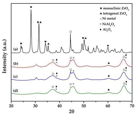 The X-ray diffraction patterns of the reduced (a) 10Ni/ZrO2 (b) 10Ni-1ZrO2/Al2O3 (CI), (c) 10Ni-10ZrO2/Al2O3 (CI), and (d) 10Ni-10ZrO2/Al2O3 (SI).