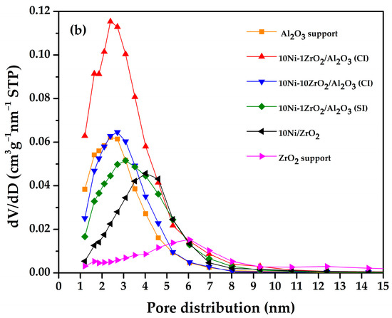 (a) N2 adsorption-desorption isotherms and (b) BJH pore size distributions of Al2O3 support, ZrO2 support, 10Ni/ZrO2, 10Ni-1ZrO2/Al2O3 (CI), 10Ni-10ZrO2/Al2O3 (CI), and 10Ni-10ZrO2/Al2O3 (SI).