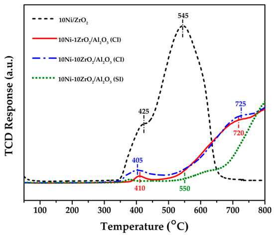 Three temperature ranges of reduction peaks were detected in the H2-TPR profiles from 50 °C to 800 °C of all calcined catalysts (Figure 3). Peaks at low temperatures (350 °C to 500 °C) coincide with the reduction of isolated NiO at the catalyst surface as well as the reduction of NiO weakly interacting with the support [36]. The higher temperature peaks at approximately 500 °C to 650 °C are assigned to the reduction of NiO having a medium interaction with the support. Reduction peaks at temperatures over 650 °C reflect the reduction of the Ni2+ species in the strong metal-support interaction (SMSI) oxides (such as the NiAl2O4 spinel phases) [35,37]. The H2-TPR profile of the 10Ni/ZrO2 catalyst (ZrO2 as support) displayed the peak shoulder centered at 425 °C and the large reduction peak centered at 545 °C. These overlapping peaks refer to the reduction of the NiO species in a weak and a medium interaction with the support [33]. The reduction at the low and medium temperatures with the greatest amount of H2 consumption in the TPR profile of the 10Ni/ZrO2 represents the reduction of large NiO particles with the weakest metal-support interaction among all samples. The reason could be ascribed to the low surface area of ZrO2 support simultaneously with the poor NiO-ZrO2 interaction. The H2-TPR profiles of the different ZrO2 contents on the surface of the 10Ni-xZrO2/Al2O3 (CI) catalysts established two temperature peaks. The small peaks at low temperatures (centered at 405 °C to 410 °C) are correlated to the reduction of the NiO in the weak metal-support interaction [34]. The broad reduction peaks at 550 °C to 800 °C are attributed to the reduction of the Ni2+ species in a medium associated with a strong metal-support interaction [33,36,38]. The peak in H2-TPR profile of 10Ni-10ZrO2/Al2O3 (SI) starting at 550 °C indicates only the reduction of the NiO species in a medium and a strong metal-support interaction. When compared to 10Ni-10ZrO2/Al2O3 (CI), peaks in the H2-TPR profile of 10Ni-10ZrO2/Al2O3 (SI) shifted toward higher temperatures. This characteristic corresponds to a stronger metal-support interaction representing the smaller and well-dispersed NiO species in 10Ni-10ZrO2/Al2O3 (SI). Considering the result of the Ni dispersion, BJH pore distribution, and H2-TPR that exhibited the stronger interaction in the 10Ni-10ZrO2/Al2O3 (SI) catalyst, it suggests the formation of the ZrO2-Al2O3 composite where the ZrO2 probably incorporated into the Al2O3 at the first step of the sequential impregnation [35,39,40] before the Ni solution was loaded. The composite enhances the interaction between the Ni and the ZrO2 in the ZrO2-Al2O3 composite phase compared to the Ni and the ZrO2 in the ZrO2 phase.