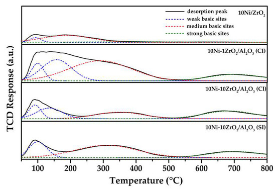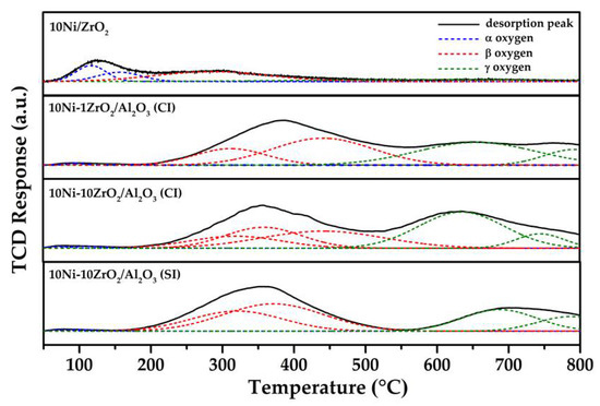 The oxygen mobility is a property of a catalyst that relates to its carbon resistance. In order to determine the oxygen mobility properties of reduced catalysts, O2-TPD measurement was performed. O2-TPD profiles (Figure 5) from 50 °C to 850 °C of all samples depicted three temperature ranges of desorption peaks. Peaks at low temperature (before 250 °C), known as α oxygen, are attributed to the desorption of weakly chemisorbed oxygen molecules on the surface. The peaks at 250 °C to 550 °C, known as β oxygen, are ascribed to the desorption of the oxygen species nearby the vacancy sites. Desorption peaks at temperature higher than 550 °C, known as γ oxygen, are assigned to the release of bulk lattice oxygen [41,42,43]. The total number of O2 desorption of 10Ni/ZrO2, 10Ni-1ZrO2/Al2O3 (CI), 10Ni-10ZrO2/Al2O3 (CI), and 10Ni-10ZrO2/Al2O3 (SI) catalysts were 0.176, 0.297, 0.344, and 0.429 mmol⋅gcat−1 (Table 2), respectively. Although the O2-TPD profile of the 10Ni/ZrO2 catalyst (ZrO2 as a support) demonstrated the minimum total O2 desorption, it provided the highest numbers of α oxygen. When ZrO2 located at the surface and interacted greater with Ni, the number of oxygen desorption increased with the larger amounts of β and γ oxygen. It suggests more oxygen desorption from vacancy sites and the bulk lattice. Regarding to γ oxygen among 10Ni-1ZrO2/Al2O3 (CI), 10Ni-10ZrO2/Al2O3 (CI), and 10Ni-10ZrO2/Al2O3 (SI) catalysts, the most uniform γ oxygen species was observed in the O2-TPD profile of the 10Ni-10ZrO2/Al2O3 (SI) catalyst. This result implies the most uniform NiO-ZrO2 interaction in the bulk.