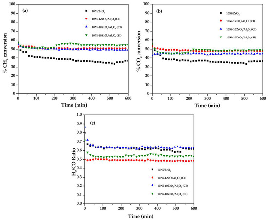 The results of CRM catalytic tests over the Ni-based catalysts with the ZrO2 as a different component are illustrated in Figure 6. Considering the CRM results with the characterization results, the 10Ni/ZrO2 catalyst (ZrO2 as a support) represented the lowest catalytic activity. This low activity is explained by its weakest Ni-ZrO2 interaction compared to other catalysts, eventuating in the low dispersion with the large Ni particle size [44]. The similarly high CH4 and CO2 conversions were observed over the catalysts with a ZrO2 promoter and a ZrO2 coactive component. These relatively high catalytic activities are subjected to (i) the stronger interaction of the Ni-Al2O3 and/or the ZrO2-Al2O3 composite in the 10Ni-xZrO2/Al2O3 catalysts, leading to the better dispersion with the smaller Ni particle size that increases the Ni surface area [33,40] and (ii) the ZrO2 surface that improves the CO2 adsorption and dissociation. Furthermore, the reactant conversions of 10Ni-10ZrO2/Al2O3 catalyst increased for 4% approximately after 200 min of time-on-stream. It can be hypothesized that after 200 min, the effective coke oxidation was involved in the CRM process due to the strongest metal-support interaction combined with the β oxygen species. The pathway of rapid oxygen transport from ZrO2 through vacancies to Ni improves CO2 activation-dissociation via vacancy sites of ZrO2. This reason allowed CH4 to be activated more efficiently on Ni. Figure 6c depicts that the H2/CO ratio in the catalytic profile of all catalysts was lower than unity because of the reverse water-gas shift side reaction (R4). At the first 20 min of time-on-stream, H2/CO ratio decreased for all the studied samples excluding 10Ni-1ZrO2/Al2O3 (CI). It can be explained by the mechanism of CRM and CO2-TPD results. Many studies reported that the CRM reaction involves CH4 dissociation as well as CO2 dissociation. The dissociative chemisorption of CH4 was denoted as an initial step and other steps take place along the time. Because CH4 is a source of H2 and CO2 can be counted as a source of CO in the syngas product, the decreasing trend of H2/CO ratio of each catalyst was observed at the beginning. Differently, the stable lowest H2/CO ratio was obtained from the 10Ni-1ZrO2/Al2O3 (CI) catalyst as it is the most active catalyst material for CO2 activation-dissociation (discussed in CO2-TPD part) that can drive CO2 dissociation since the beginning. Moreover, the H2/CO ratio of 10Ni-10ZrO2/Al2O3 (SI) was also low due to the high CO2 activation-dissociation via the vacancies. In addition, the catalytic activities in this work are in the same range of literature data (Table 3).