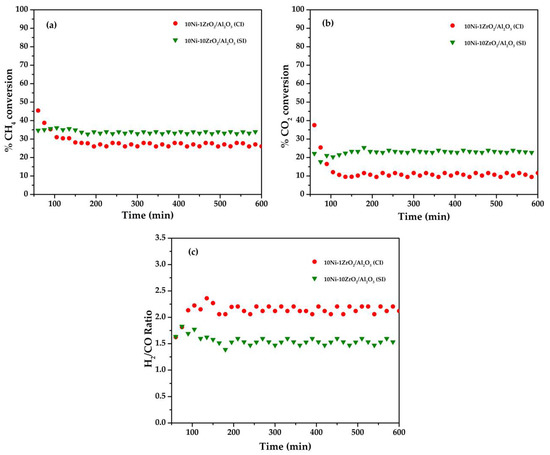 According to CRM results, the 10Ni-1ZrO2/Al2O3 (CI) catalyst and the 10Ni-10ZrO2/Al2O3 (SI) catalyst were more selective toward CO2 activation-dissociation as a different behavior. Thus, these two catalysts were chosen here for investigation in a CSCRM test using a similar condition to CRM with the additional steam, and the results are shown in Figure 7. During the first 100 min of time-on-stream, the CH4 conversion as well as the CO2 conversion decreased to approximately constant, and the H2/CO ratio became almost stable on both catalysts. It could be counted on the adjustment of such a complex reaction. After 100 min, the 10Ni-10ZrO2/Al2O3 (SI) catalyst established lower CH4 conversion, lower CO2 conversion, and higher H2/CO ratio than those obtained from the 10Ni-1ZrO2/Al2O3 (CI) catalyst. It implied that a larger number of active sites on the 10Ni-10ZrO2/Al2O3 (SI) catalyst were occupied by the reaction loop of H2O activation-dissociation compared to the 10Ni-10ZrO2/Al2O3 (SI) catalyst. Consequently, the H2O activation-dissociation was promoted greater on the basic sites than on the vacancy sites in CSCRM for this catalyst set.